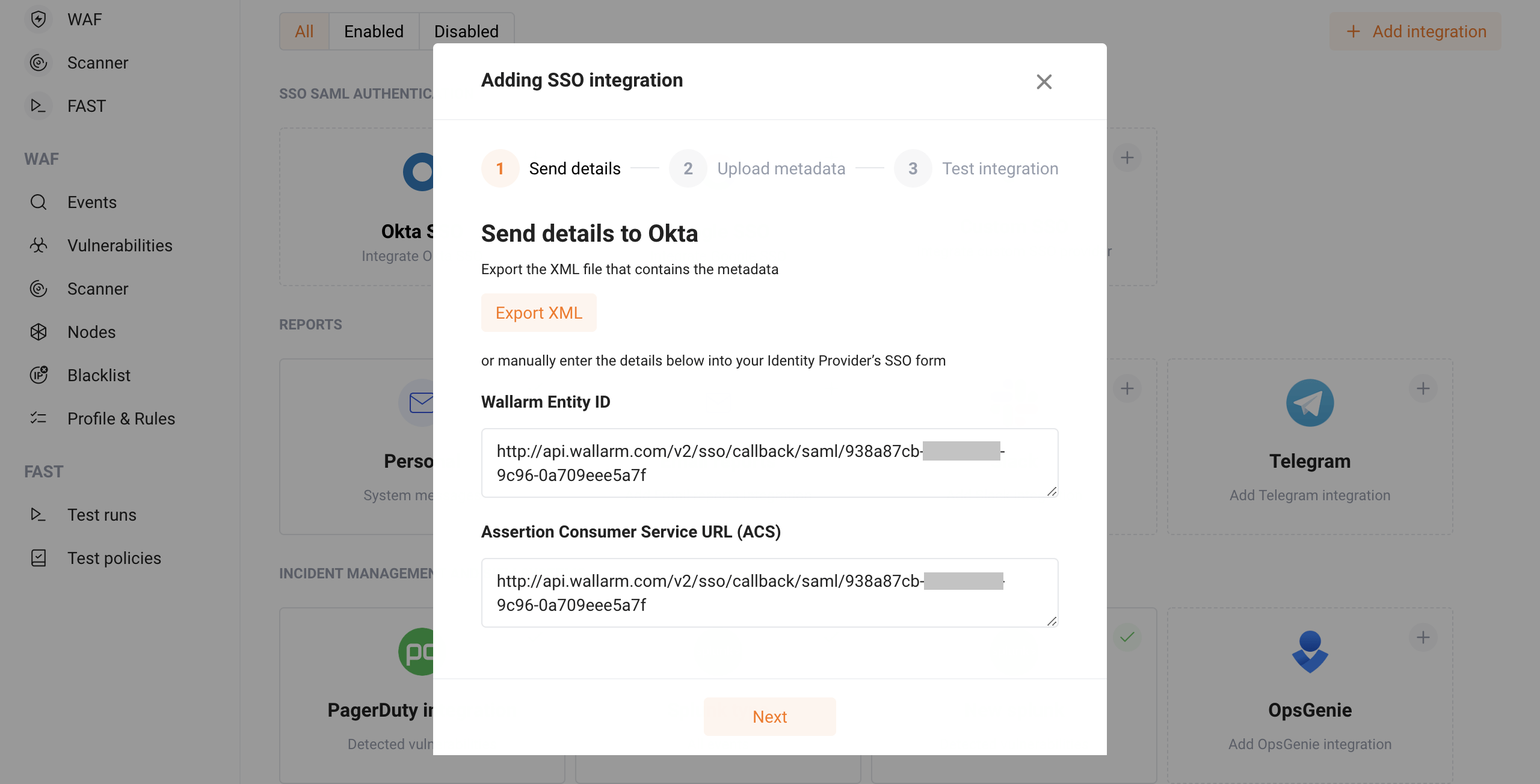 • Audience URI (SP Entity ID) = Wallarm Entity ID in Wallarm.