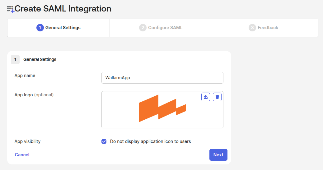 4. Proceed and in the Create SAML Integration wizard set general integration settings, such as App Name and optionally App logo.