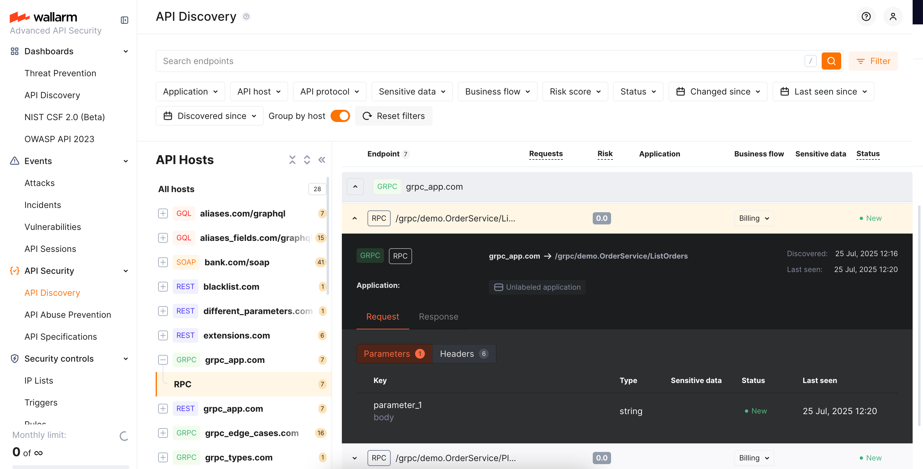 Wallarm discovers general gRPC services that use protocol buffers, on which gRPC relies when defining gRPC message data types: