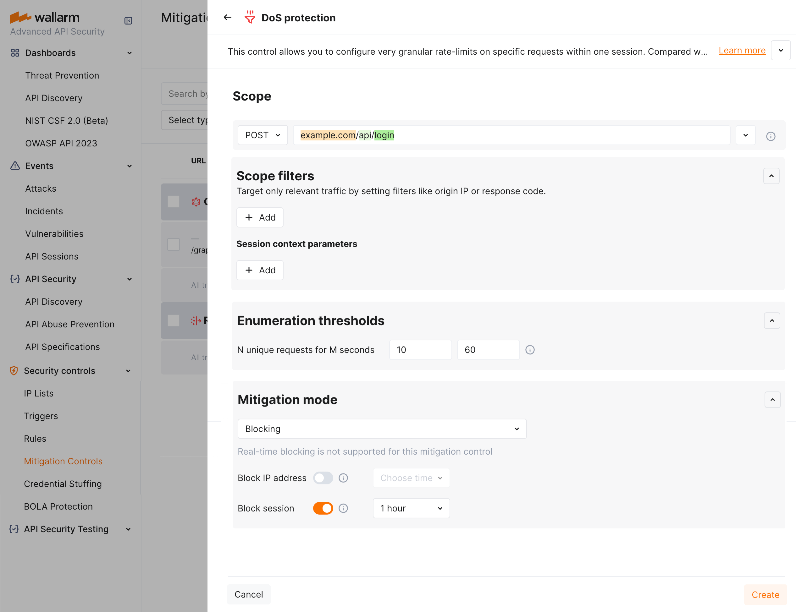 Suppose your application accepts POST requests that include a Bearer JWT at the https://example.com/api/login endpoint. We want to block for 1 hour sessions within which more than 10 requests per 60 seconds are sent to this endpoint. For this scenario, the mitigation control limiting requests per time will appear as follows: