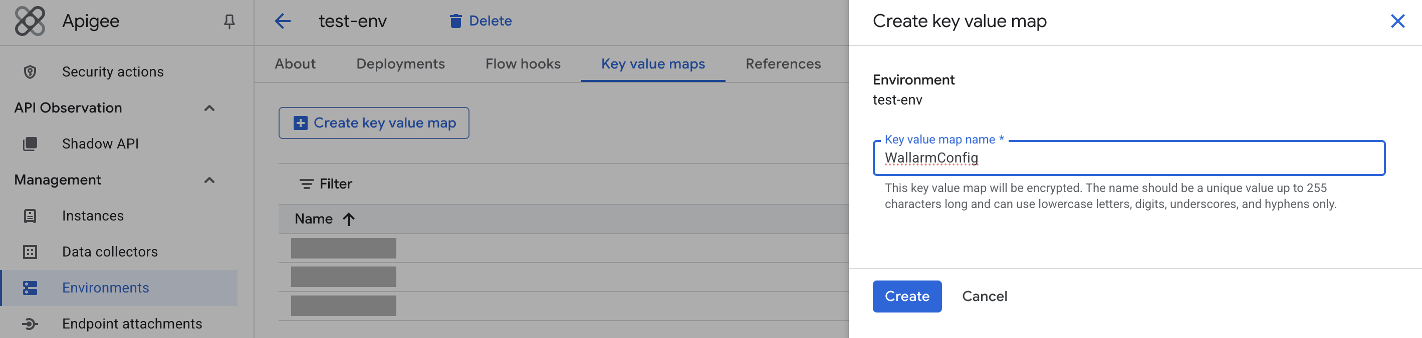 In Google Cloud Console → Management → Environments → your environment → Key value maps, Create the WallarmConfig KVM.