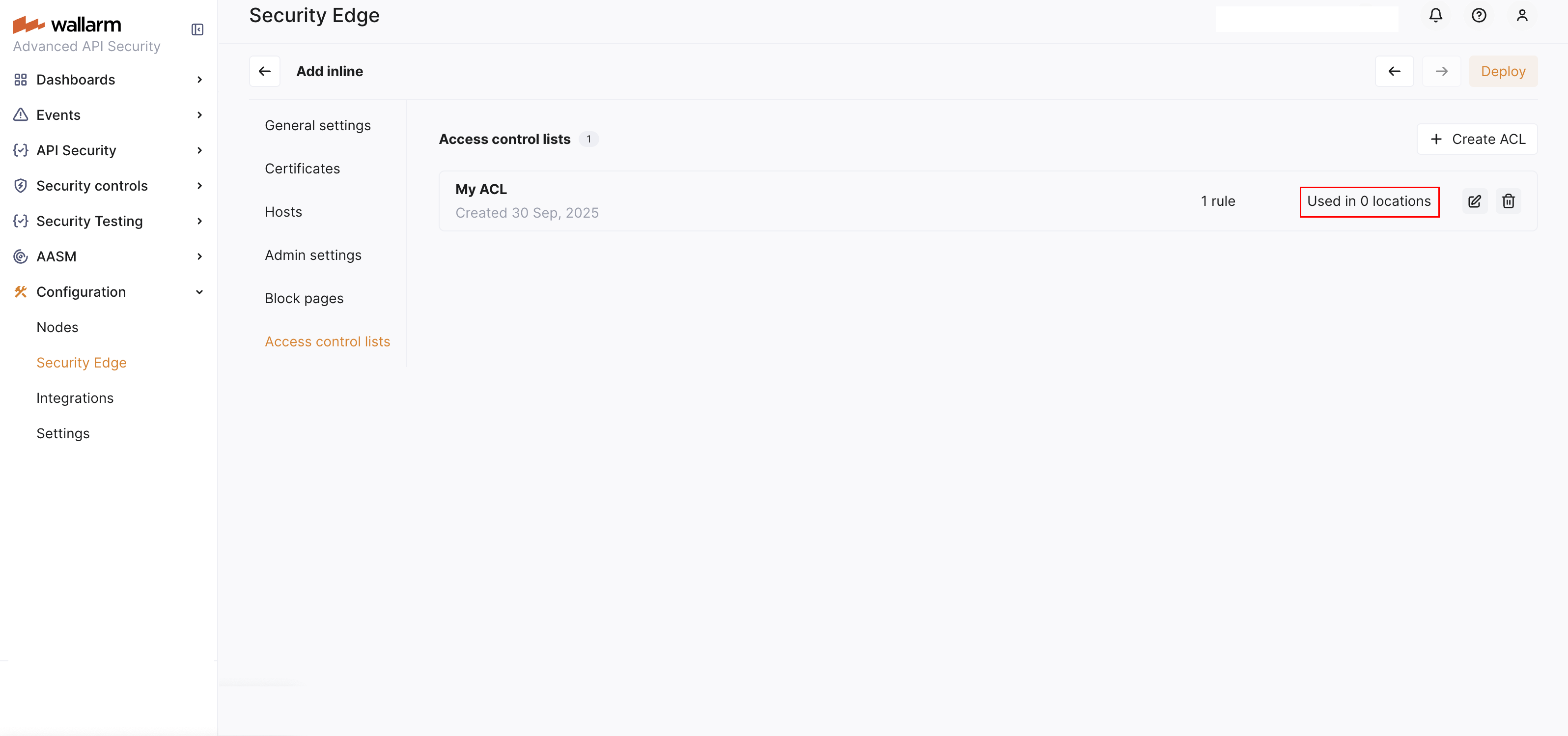 Go to Wallarm Console โ Security Edge โ Inline โ Configure โ Access control lists and click Create ACL.