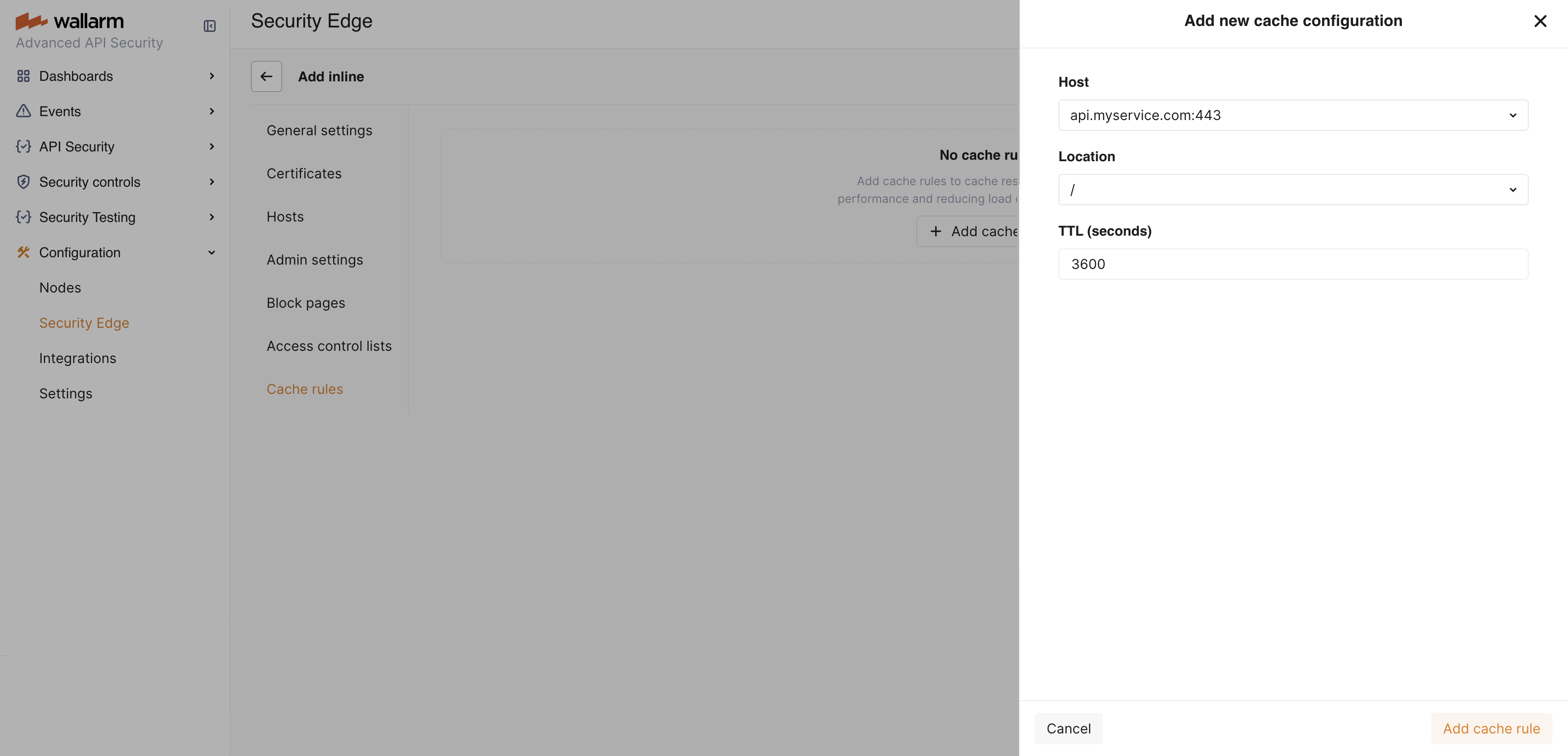 Go to Wallarm Console โ Security Edge โ Inline โ Configure โ Cache rules.