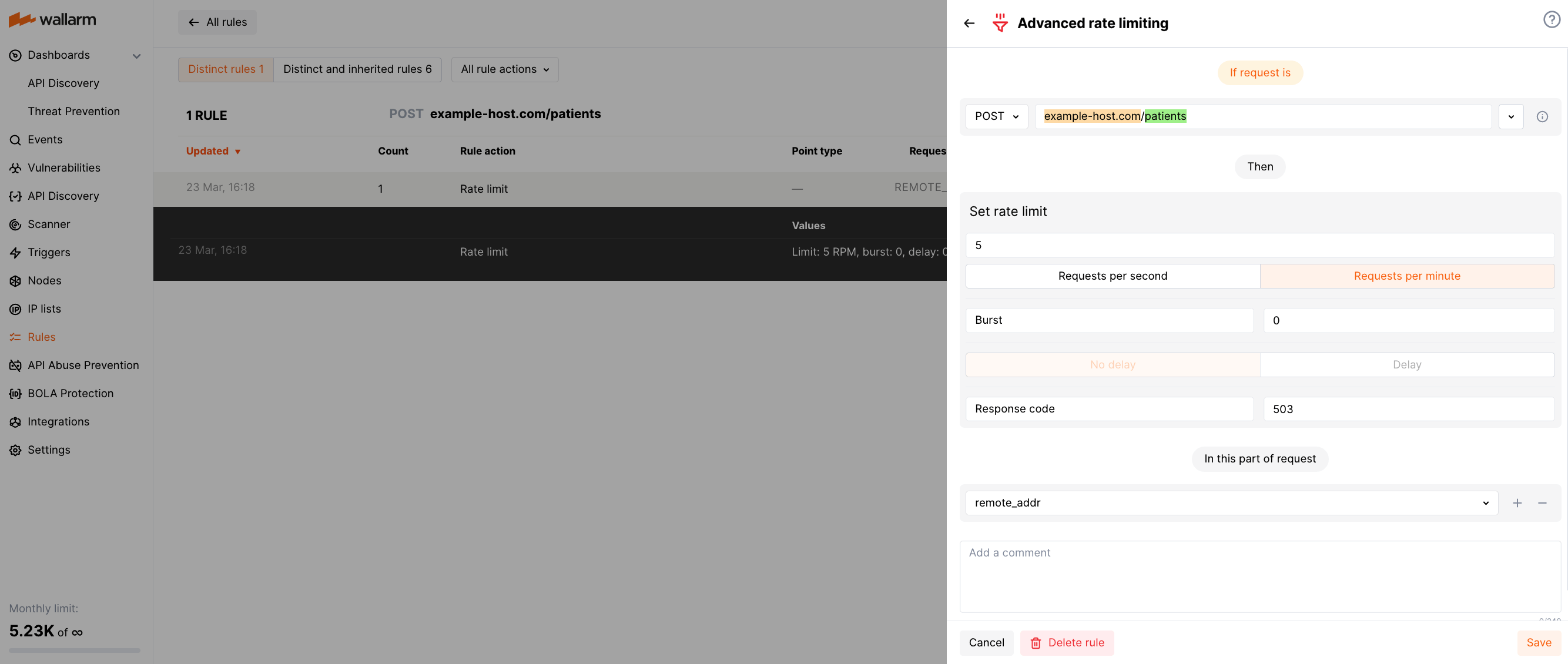 ngx_http_limit_req_moduleNGINX module) and you also apply the Wallarm rule, the web server rejects requests by the configured rules but Wallarm does not. -