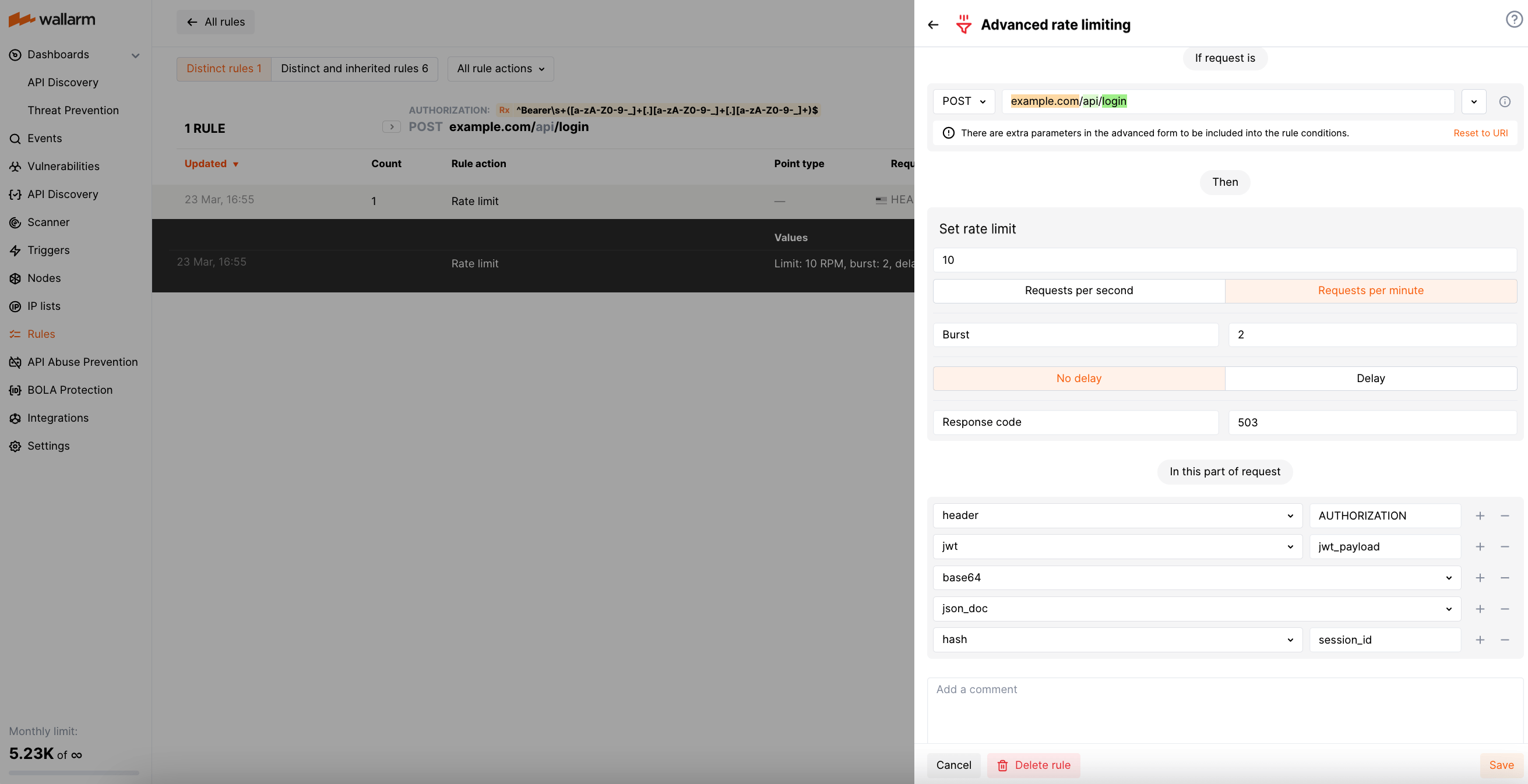 Wallarm provides the Advanced rate limiting rule to help prevent excessive traffic to your API. This rule enables you to specify the maximum number of connections that can be made to a particular scope, while also ensuring that incoming requests are evenly distributed. If a request exceeds the defined limit, Wallarm rejects it and returns the code you selected in the rule.
