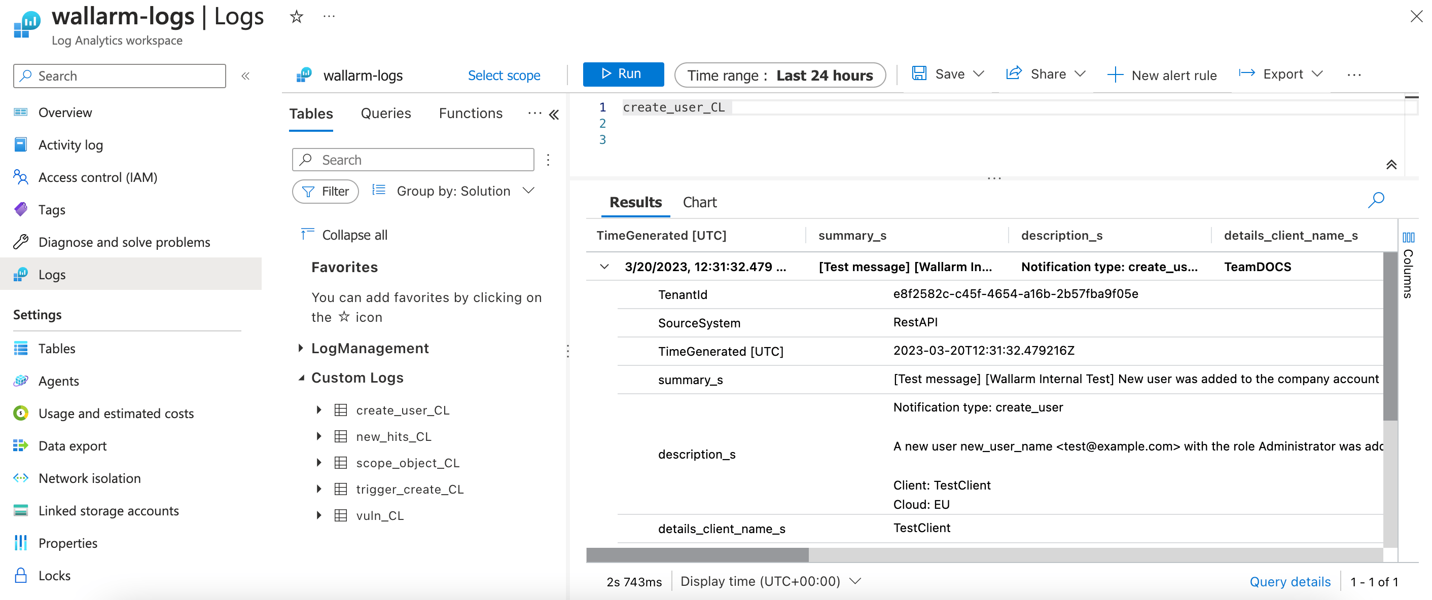 You can find Wallarm logs in your Microsoft Workspace → Logs → Custom Logs, e.g. the test