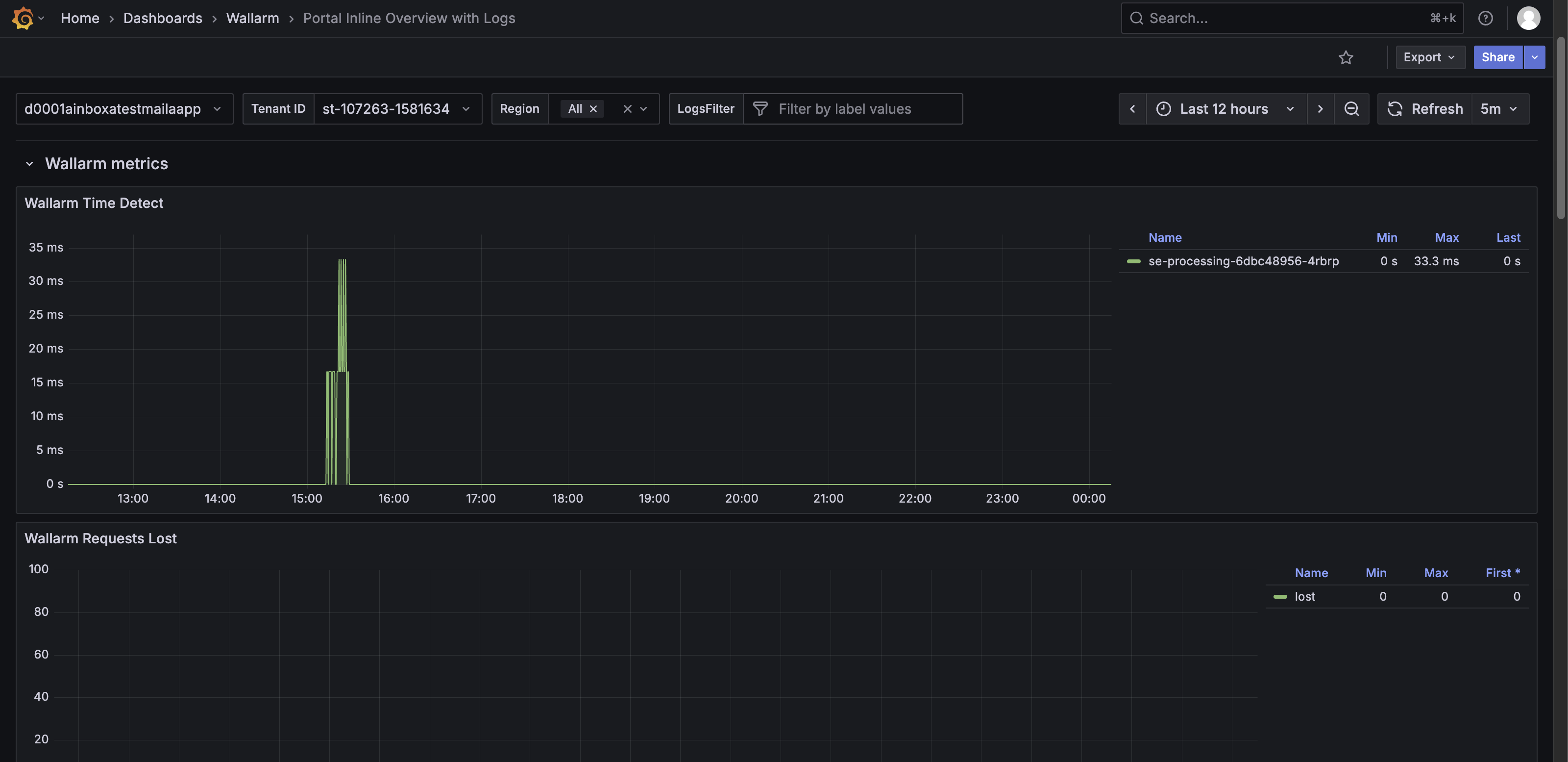 • Wallarm Time Detect – Shows the time Wallarm takes to detect threats for requests, with a timeline graph and Min/Max/Last values.