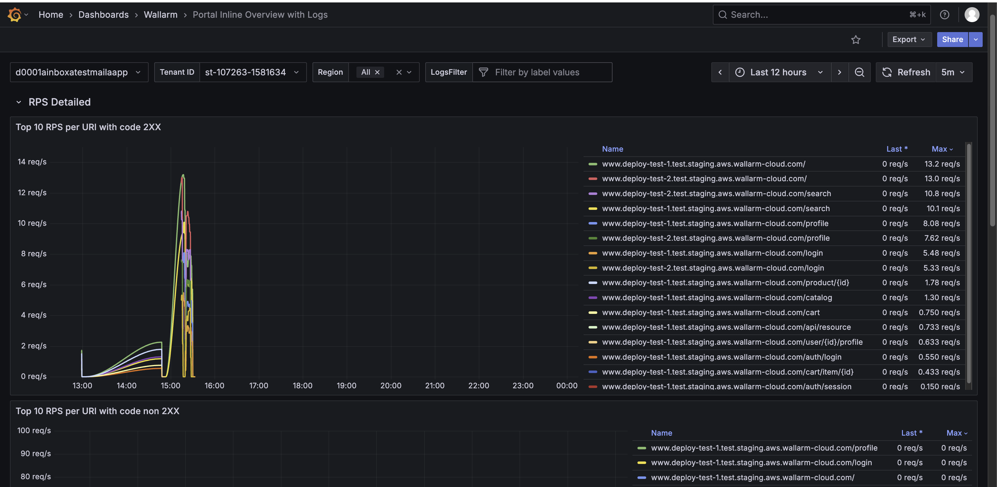 • Top 10 RPS per URI with code non-2XX – Shows URIs generating client or server errors (any HTTP code other than 2XX).