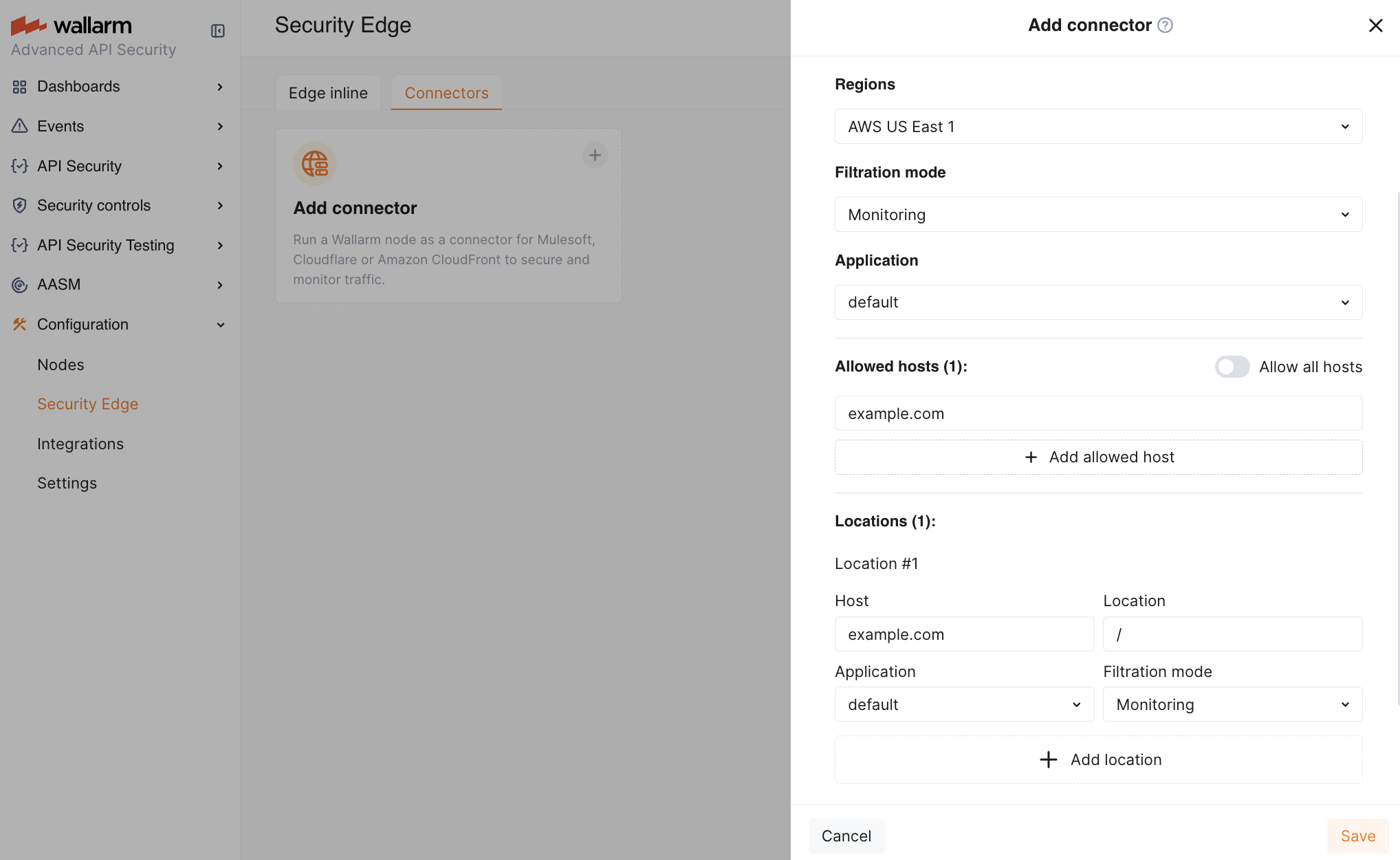 Wallarm Console → Security Edge → Connectors → Add connector adımlarını izleyin.